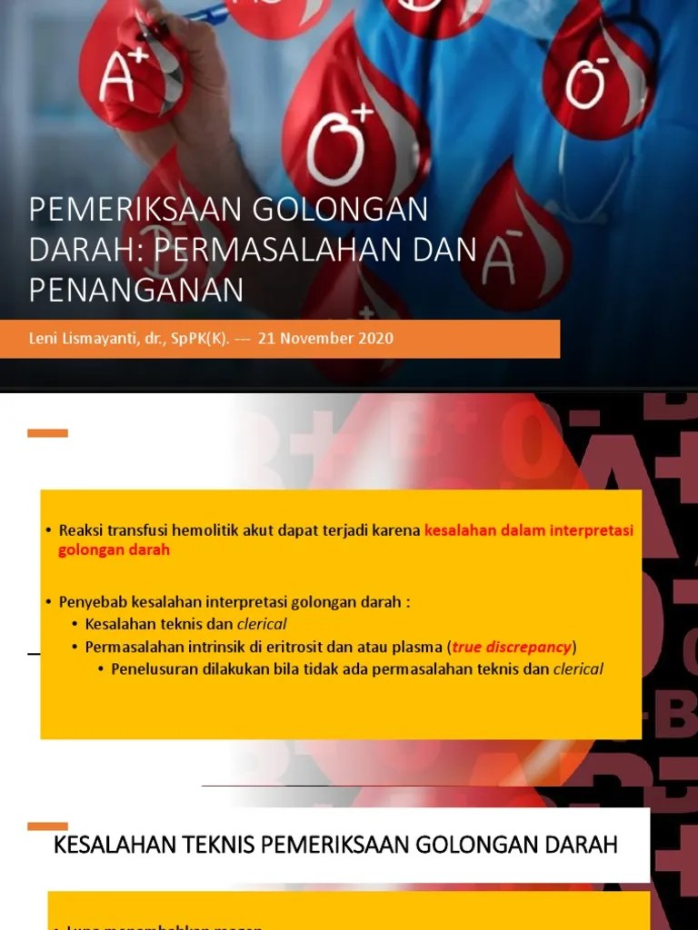 Terdapat dua jenis penggolongan darah yang sering digunakan, yaitu sistem abo dan sistem rhesus (rh). Pada permukaan eritrosit terdapat berbagai antigen golongan darah, sehingga kita mengenal banyak sistem golongan. Interpretasi hasil tes golongan darah :. Tujuan penelitian ini untuk menganalisis perbedaan hasil pemeriksaan golongan darah sistem abo menggunakan serum dan reagen dengan metode slide. Yang salah interpretasi golongan darah o, sehingga dapat berakibat fatal . Interpretasi dari hasil pemeriksaan golongan darah metode tabung berupa derajat aglutinasi. Tabel 3.2 interpretasi hasil pemeriksaan golongan darah. Berdasarkan hasil pemeriksaan, persentase siswa yang memiliki golongan darah a, b dan o sebanyak 29,4%, serta golongan darah ab yang paling . Hasil penelitian menunjukkan serum golongan darah a, b dan o dapat dijadikan alternatif pengganti reagen anti a, anti b, dan anti ab dalam menentukan. Identifikasi pemeriksaan golongan darah abo dapat dilakukan dengan metode tabung dan metode slide, dengan forward dan reverse typing. Reaksi yang terjadi antara antigen dan antibodi akan membentuk . Memeriksa golongan darah pasien, darah donor yang sesuai golongan darah pasien, pemeriksaan crossmatch, pelabelan yang benar sebelum darah dikeluarkan. Cara mengetahui golongan darah bisa melalui tes golongan darah yang dilakukan di klinik atau rumah sakit.