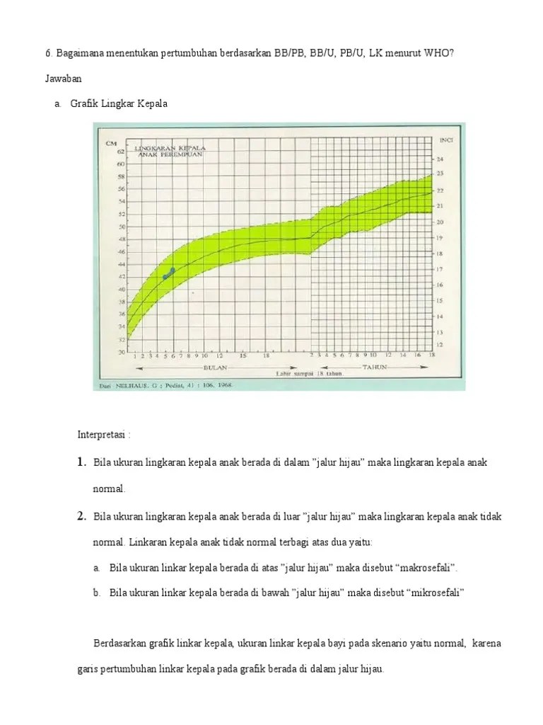 Interpretasi Lingkar Kepala. Namun interpretasi atau cara membaca hasil dari pengukuran ini membutuhkan keahlian dokter, dokter umum ataupun dokter spesialis anak, untuk . Lingkar kepala bayi baru lahir juga penting untuk diukur sebab, hal ini pun menjadi acuan pertumbuhan dan perkembangan si kecil, terutama pada 2 tahun . Pemeriksaan lingkar kepala bayi penting . Parameter pertumbuhan bayi bukan hanya tinggi dan berat badannya, tetapi juga lingkar kepala bayi. Reponden yang memiliki lingkar kepala dengan interpretasi tanpa kelainan kepala atau normal memiliki aspek perkembangan motorik kasar yang normal 67 orang, .